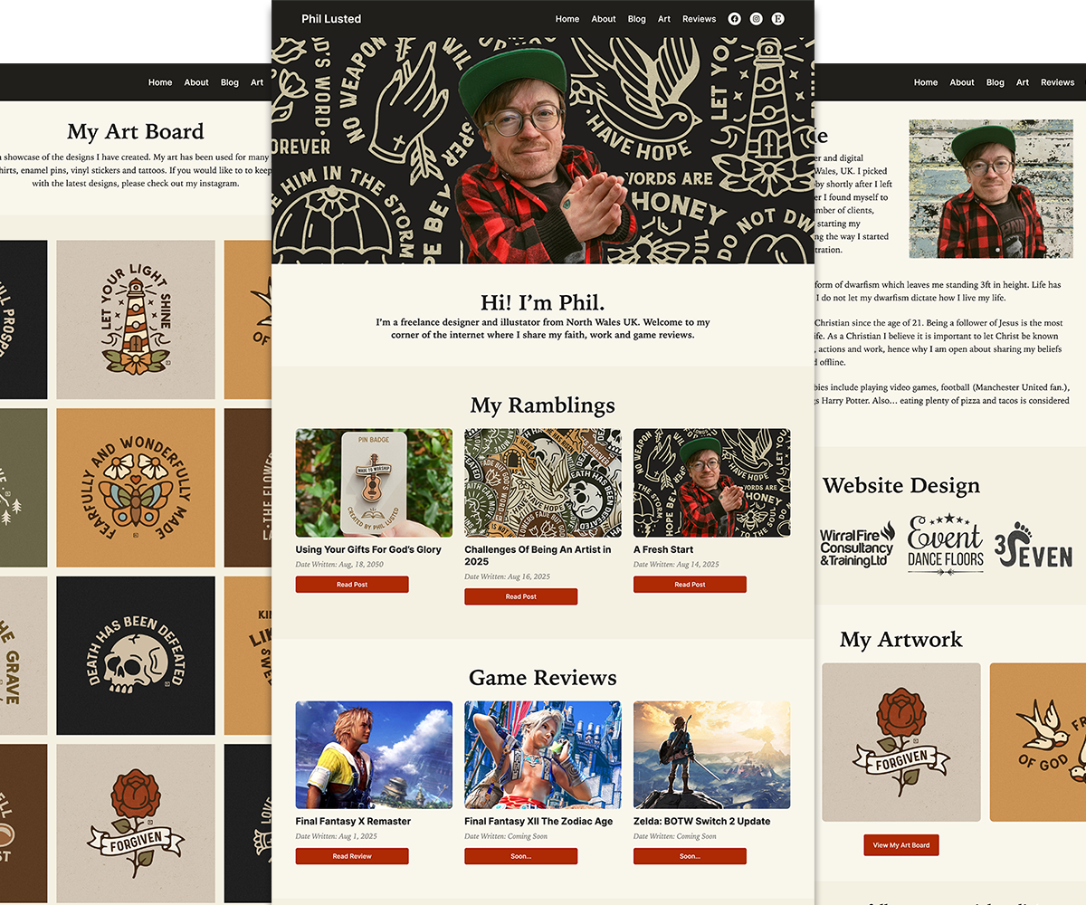 The art board page covers a large range of artwork I have created over the last few years, this won’t be updated often. You are still best following me via instagram to keep up with my art designs, either via my work account @LittlePhilz or my personal account @PhilzLusted. The about page has a list of business websites I have designed and still currently maintain and moderate.